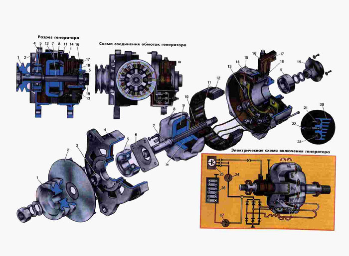 1. Шкив. 2. Центробежный вентилятор. 3. Распорная втулка. 4. Крышка со стороны шкива. 5. Шариковый подшипник. 6. Держатель подшипника. 7. Вал якоря. 8. Магнитопровод ротора. 9. Обмотка возбуждений ротора. 10. Контактное кольцо. 11. Обмотка статора. 12. Магнитопровод статора. 13. Выпрямительный блок. 14. Крышка со стороны контактных колец. 15. Клемма "+". 16. Щеткодержатель. 17. Клемма "Ш". 18. Щетка. 19. Крышка подшипника. 20. Теплоотвод выпрямительного блока. 21. Диод с положительной полярностью. 22. Клемма выпрямительного блока. 23. Диод с отрицательной полярностью. 24. Выключатель зажигания. 25. Регулятор зажигания. 26. Аккумуляторная батарея. 27. Амперметр. 28. Втулка ротора. |