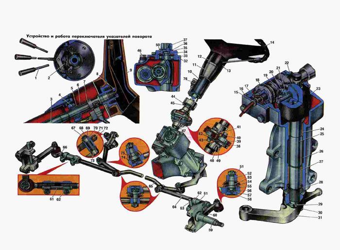 1. Рычаг переключения указателей поворота. 2. Переключатель указателей поворота. 3. Вал рулевого управления. 4. Подшипник вала. 5. Разжимная втулка. 6. Пружина. 7. Втулка сбрасывателя переключателя указателей поворота. 8. Гайка. 9. Кнопка сигнала. 10. Колонка. 11. Нижний колпак. 12. Верхний колпак. 13. Крышка. 14. Рулевое колесо. 15. Передняя крышка картера. 16. Регулировочные прокладки. 17. Подшипник червяка. 18. Червяк. 19. Ролик. 20. Подшипник ролика. 21. Ось ролика. 22. Сальниковое уплотнение. 23. Картер. 24. Верхняя втулка. 25. Вал сошки. 26. Распорная втулка. 27. Нижняя втулка. 28. Сальниковое уплотнение. 29. Пружинная шайба. 30. Гайка. 31. Сошка. 32. Прокладка. 33. Верхняя крышка картера. 34. Регулировочный винт. 35. Регулировочная шайба. 36. Стопорная шайба. 37. Контргайка. 38. Муфта. 39. Подкладка. 40. Пленка. 41. Провод сигнала. 42. Шайба. 43. Втулка. 44. Отражатель. 45. Пружина. 46. Пробка. 47. Фланец. 48. Палец. 49. Гайка. 50. Штифт. 51. Гайка. 52. Шаровой палец. 53. Распорная втулка. 54. Уплотнитель. 55. Корпус шарнира. 56. Опорная пята. 57. Дружина. 58. Заглушка. 59. Поворотный кулак. 60. Поворотный рычаг. 61. Регулировочная трубка. 62. Стяжной хомут. 63. Шкворень. 64. Тяга. 65. Тяга сошки. 66. Наконечник рулевой тяги. 67. Палец. 68. Гайка. 69. Шайба. 70. Металлокерамическая втулка. 71. Уплотнительная втулка. 72. Кронштейн маятникового рычага. 73. Маятниковый рычаг. 74. Сухарь. 75. Уплотнительный колпак. 76. Противоугонное устройство. |