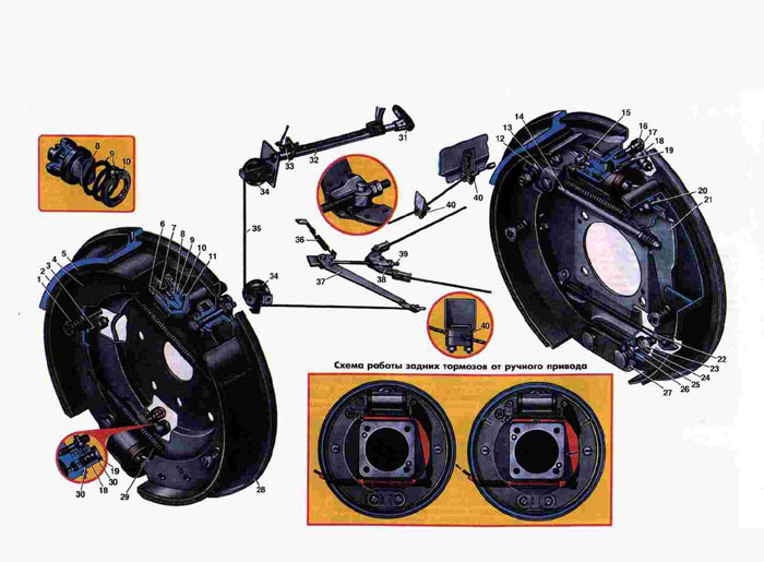 1. Прижимное устройство. 2. Барабан. 3. Упорный винт. 4. Колодка. 5. Накладка фрикционная. 6. Колпак защитный. 7. Опорный сухарь. 8. Поршень цилиндра. 9. Уплотнительные кольца поршня. 10. Упорное кольцо поршня. 11. Цилиндр переднего тормоза. 12. Регулировочный эксцентриковый болт. 13. Маятниковый рычаг. 14. Разжимной стержень. 15. Цилиндр заднего тормоза. 16. Перепускной клапан. 17. Колпачок защитный. 18. Соединительная муфта. 19. Болт соединительной муфты. 20. Палец. 21. Рычаг привода ручного тормоза. 22. Тяга. 23. Гайка. 24. Шайба. 25. Опорный палец. 26. Эксцентрик опорного пальца. 27. Планка. 28. Щит тормоза. 29. Стяжная пружина. 30. Уплотнительная шайба. 31. Рукоятка ручного тормоза. 32. Стержень. 33. Включатель контрольной лампочки. 34. Ролик. 35. Трос. 36. Оттяжная пружина. 37. Рычаг. 38. Уравнитель. 39. Тяга. 40. Кронштейн направляющей троса. |