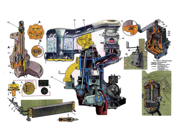 работавших газов.  1. Масляный радиатор 2. Впускной клапан масляного радиаюра. 3. Запорный кран масляного радиаторе. 4. Тройник главной масляной магистрали. 5. Диафрагма датчика давления масла. 6. Упругая пластина. 7. Биметаллическая пластина датчика. 8. Биметаллическая пластина приемника 9. Фильтрующая сетка маслоприемника. 10. Ведомая шестерня масляного насоса 11. Ведущая шестерня масляного насоса. 12. Шестерня привода масляного насоса. 13. Предохранительный клапан масляного насоса. 14. Фильтр грубой очистки масла. 15. Шланг вентиляции масляного картера. 16. Воздухоочиститель. 17. Перепускной клапан фильтра грубой очистки. 18. Карбюратор. 19. Пружина. 20. Гайка сальника валика. 21. Валик поворота пластинчатого фильтрующего элемента. 22. Промежуточная пластина. 23. Фильтрующая пластина. 24. Очищающая пластина. 25. Фильтр тонкой очистки масла. 26. Картонная фильтрующая прокладка. 27. Картонная фильтрующая пластина. 28, 29. Пробки сливных отверстий. |