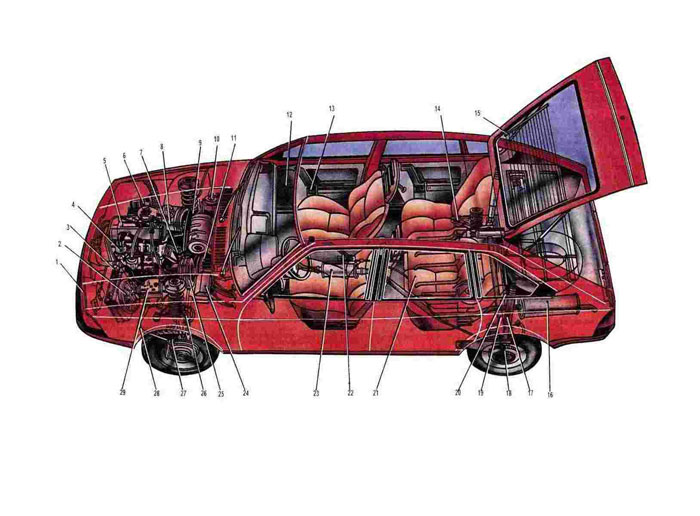 1. Фара 2. Электровентилятор системы охлаждения двигателя. 3. Радиатор системы охлаждения двигателя. 4. Распределитель зажигания. 5. Двигатель. 6. Аккумуляторная батарея. 7. Катушка зажигания. 8. Воздушный фильтр. 9. Телескопическая амортизаторная стойка передней подвески. 10. Бачок смывателя ветрового стекла. 11. Коробка передач. 12. Ручка стеклоподъемника. 13. Ручка внутреннего привода замка двери. 14. Рычаг задней подвески. 15. Элемент обогрева заднего стекла. 16. Основной глушитель. 17. Задний амортизатор. 18. Задний тормоз. 19. Балка задней подвески. 20. Поперечная штанга задней подвески. 21. Топливный бак. 22. Рычаг привода стояночной тормозной системы 23. Дополнительный глушитель. 24. Блок плавких предохранителей и реле. 25. Вакуумный усилитель тормозной системы. 26. Вал привода передних колес. 27. Передний тормоз. 28. Штанга стабилизатора передней подвески. 29. Расширительный бачок системы охлаждения двигателя. |