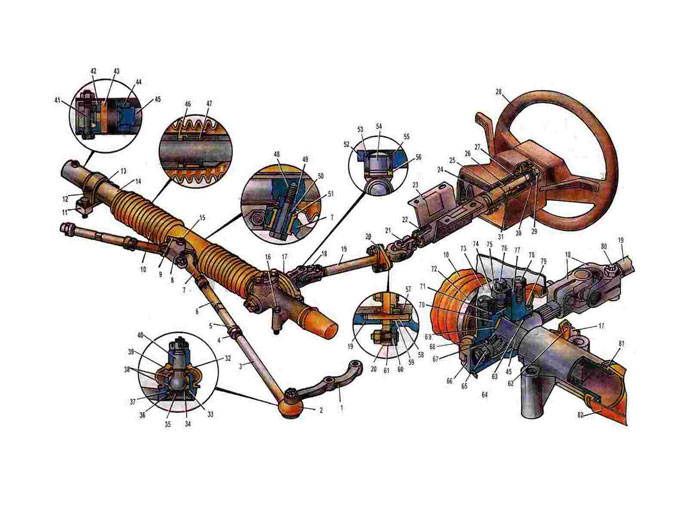1. Поворотный рычаг 2. Шаровой шарнир рулевой тяги 3. Наружный наконечник тяги. 4. Гайка наружного нако ночника. 5. Коническая втулка. 6. Регулировочная муфта. 7. Внутренний наконечник тяги 8. Накладка. 9. Скоба крепления тяги 10. Грязезащитныи чехол 11. Опора рулевого механизма 12. Скоба опоры 13. Резиновое кольцо опоры. 14 Картер рулевого механизма 15. Болт 16. Болт 17. Перегородка щита передка кузова 18. Нижний карданный шарнир. 19. Карданный вал 20. Упругая муфта 21. Верхний карданный шарнир. 22. Нижний подшипник 23. Кронштейн рулевой колонки 24. Запорная втулка противоугонного устройства. 25. Труба рулевой колонки 26. Втулка верхнего подшипника рулевого вала 27. Верхний подшипник рулевого вала 28. Рулевое колесо 29. Гайка 30. Каркас рулевого колеса 31. Рулевой вал. 32. Шайба 33. Нажимной вкладыш шарнира 34. Пружина 35. Заглушка 36. Стопорное кольцо 37. Уплотнигельное кольцо 38. Верхний и нижний вкладыши 40. Шаровой палец 41. Болт 42. Заглушка 43. Буфер 44. Ограничитель хода рейки 45. Репка 46. Оболочка опоры 47. Ограничитель хода рейки 45. Рейка 46. Оболочка опоры 47. Втулка опоры рейки 48. Болт крепления тяги к рейке 49. Дистанционная втулка 50. Втулка сайлент-блока 51. Резиновая втулка сайлент-блока 52. Вилка карданного шарнира 53. Подшипник крестовины 54. Крестовина 55. Игольчатый подшипник 56. Уплотнительное кольцо подшипника 57. Фланцевая вилка верхнего карданного шарнира 58. Штифт 59. Втулка 60. Шпилька 61. Распорная втулка 63. Задний подшипник. |