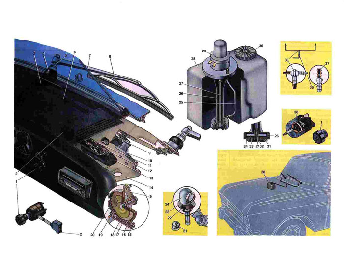 1. Ручка выключателя стеклоочистителя и смывателя. 2. Штекерная колодка. 3. Поводок привода щетки. 4. Декоративная накладка штуцера. 5. Гайка сальника валика привода щетки. 6. Тяга привода большая. 7. Рычаг. 8. Коромысло со щеткой. 9. Кривошип редуктора. 10. Редуктор привода стеклоочистителя. 11. Термобиметаллический предохранитель. 12. Сопротивление. 13. Электродвигатель привода стеклоочистителя. 14. Кронштейн стеклоочистителя. 15. Винт подпятника. 16. Шарик упорный червяка. 17. Шестерня редуктор. 16. Червяк редуктора. 19. Контактный диск. 20. Корпус редуктора. 21. Винт жиклера. 22. Кольцо втулки жиклкрд 23. Втулка жиклера. 24. Жиклер смывателя. 25. Трубка отвода жидкости. 26. Корпус насоса омывателя. 27. Вал насоса. 28. Бачок омывателя. 29. Электродвигатель насоса. 30. Пробка бачка. 31. Ободок фильтра. 32. Сетчатый фильтр. 33. Ротор насоса. 34. Опора фильтра. 35. Тройник смывателя. 36. Клапан омыватсля. |
