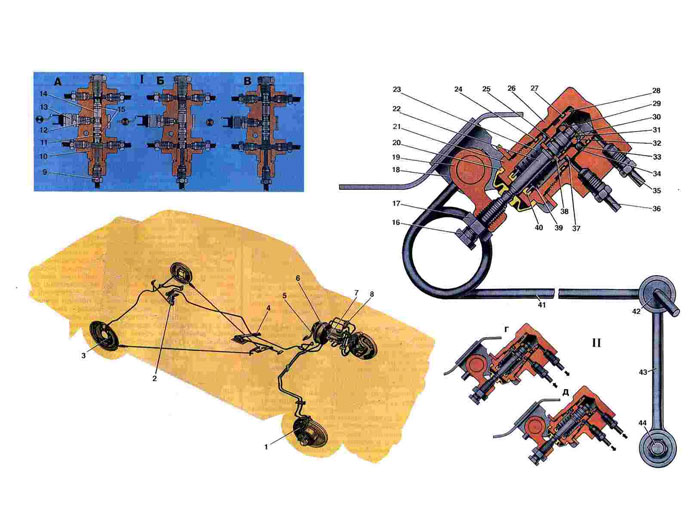 1. Тормозной механизм переднего колеса 2. Регулятор давления. 3. Тормозной механизм заднего колеса 4 Рычаг привода стояночного тормоза. 5. Педаль гидропривода тормоза 6. Вакуумный усилитель. 7. Главный цилиндр. 8. Сигнальное устройство. 9. Концевой штуцер. 10. Корпус сигнального устройства 11. Короткий поршень 12. Шарик 13. Выключатель контрольной лампы гидропривода тормозов 14. Длинный поршень. 15. Уплотнительные кольца. 16. Регулировочный болт 17. Гайка. 18. Кронштейн. 19. Нажимной рычаг. 20. Грязезашитный чехол. 21. Втулка крепления корпуса- 22. Поршень. 23. Возвратная пружина поршня. 24. Уплотнительное кольцо втулки. 25, 40 Манжета поршня. 26. Корпус регулятора давления. 27. Уплотнительное кольцо гильзы. 28. Гильза поршня. 29. Промежуточная шайба. 30. Стопорная шайба. 31. Прижимная шайба. З2. Управляющий конус. 33. Шарик клапана. 34. Прижимная пружина. 35. Трубка гидропривода к рабочим цилиндрам. 36. Трубка гидропривода от главного цилиндра. 37. Пружинная шайба. 38. Упорная скоба. 39. Распорная втулка 41. Нагрузочная пружина. 42. Втулка стойки. 43. Стойка пружины. 44. Ось кронштейна. |