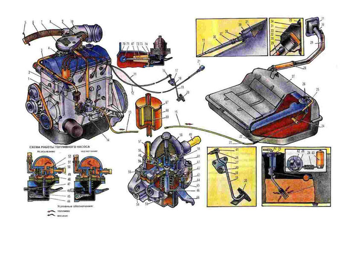 1. Шланг от топливного насоса 2 Фильтр гонкой очистки топлива. 3. Шланг подводящий к карбюратору 4. Карбюратор. 5. Зажим крепления рукава подвода холодного воздуха. 6. Рукав подвода холодного воздух. 7. Фланец подводящий карбюратора. 8. Терморегулятор. 9. Рукав. 10. Воздушный фильтр. 11. Тяга привода воздушной заслонки карбюратора 12 Трос привода дроссельной заслонки. 13. Шланг подводящий к топливному насосу. 14. Топливный насос 15. Трубка тепли вопровода передняя. 16. Муфта. 17. Кронштейн педали привода дроссельной заслонки. 18. Ось рычага педали 19. Рычаг педали. 20. Площадка педали. 21. Ручка тяги привода воздушной заслонки. 22 Трубка топливопровода задняя. 23 Шланг соединительный. 24. Фильтр приемной трубки 25. Шланг от топливного бака к топливопроводу. 26. Датчик указателя уровня топлива 27. Топливный бак. 28. Шланг соединительный наливной трубы. 29. Трубка воздушная топливного бака. 30. Трубка наливная топливного бака. 31. Уплотнитель наливной трубы. 32. Прокладка уплотнительная. 33 Пробка топливного бака. 34. Кольцо распорное. 35. Заднее крыло кузове. 36. Трубка оболочки тяги воздушной заслонки 37. Пружина фиксирующая 38. Пластина прижимная 39. Панель приборов. 40. Подшипник оси педали. 41. Демпфер муфты. 42. Трубка заборная. 43. Поплавок датчика указателя уровня топлива. 44. Ось рычага привода. 45. Рычаг привода топливного насоса. 46 Тяга диафрагмы. 47. Штанга привода. 48. Головка топливного наcoca 49. Трубка подводная. 50. Клапан нагнетательный. 51. Клапан всасы вающий. 52. Фильтр. 53. Балансир. 54. Корпус насоса. 55. Седло нагнета тельного клапана. 56 Пружина клапана 57. Трубка отводная 58. Крышка 59. Обойма фильтра. 60. Седло всасывающего клапана 61. Чашка 62. Прокладка дистанционная внутренняя. 63, 65. Диафрагмы. 64. Прокладка дистанционная наружная. 66. Рычаг ручного привода. 67. Крышка корпуса топливного фильтра. 68. Корпус топливного фильтра. 69. Элемент фильт рующий 70. Блок цилиндров. 71. Эксцентрик. 72. Проставка теплоизоляци синая. 73, 74. Прокладки уплотнительные. |
