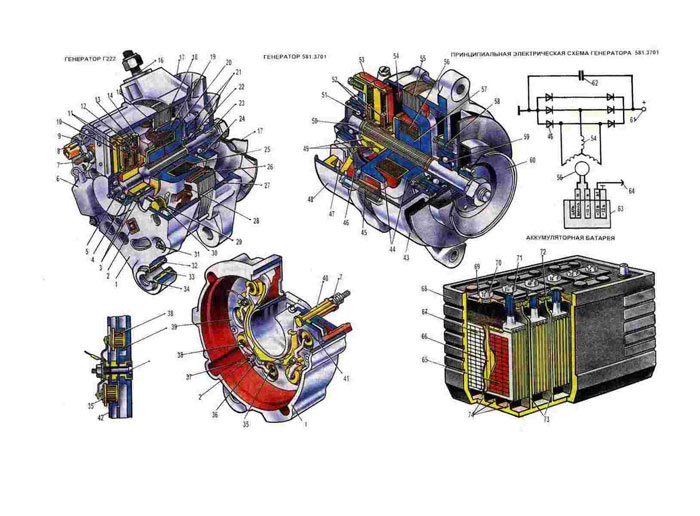 1, 48. Крышки со стороны контактных колец. 2. Болт крепления выпрямительного блока 3, 49 Контактные кольца кольца. 4, 51. Задние шарикоподшипники. 5, 50. Валы ротора. |