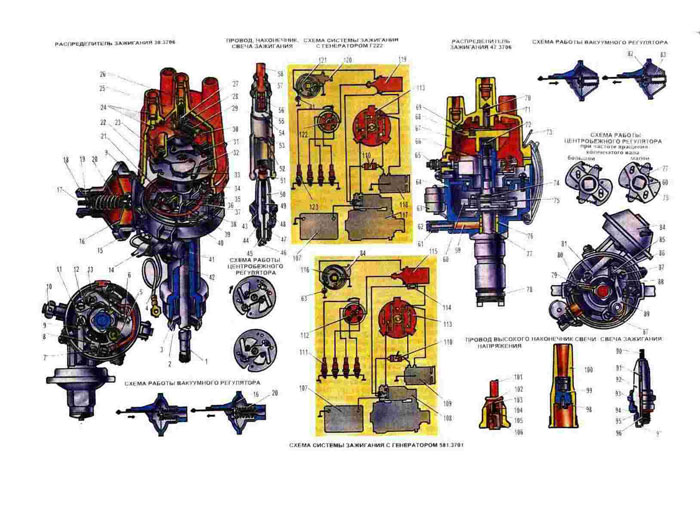 1. 77. Валики распределителей. 2. Масло отражательная муфта. 3 Шайба. 4. Провод низкого напряжения. 5. Держатель фитиля. 6, 85. Неподвижный контакт прерывателя. 7. Винт крепления проводника массы. 8. Пружинная шайба. 9, 81. Тяги вакуумных регуляторов. 10, 62. Масленки 11. Подшипник 12, 86. Подвижные пластины преры вателей. 13. Поджимная пружина прерывателя. 14, 73. Защелки. 15. Корпус вакуумного регулятора. 16, 82 Диафрагмы 17. Трубка вакуумного регулятора. 18. Крышка вакуумного регулятора 19. Гайка. 20, 83 Пружины вакуумного регулятора. 21, 59, 79. Фитили 22. Опорная пластина центробежное го регулятора. 23, 68. Роторы (бегунки) 24 Боковой электрод с клеммой 25, 67 Крышки 26 Центральный электрод с клеммой 27, 71 Контактные угольки 28, 69 Контактные пластины 29 Резистор 30 Наружный контакт ротора 31, 74. Пружины грузовиков 32, 60. Пластины центробежных регуляторов 33, 75. Грузики центробежных регуляторов. 34. Изоляционная втулка подвижного контакта. 35, 66. Кулачки прерывателя. 36. Подушечка прерывателя. 37, 89. Рычажки прерывателей. |